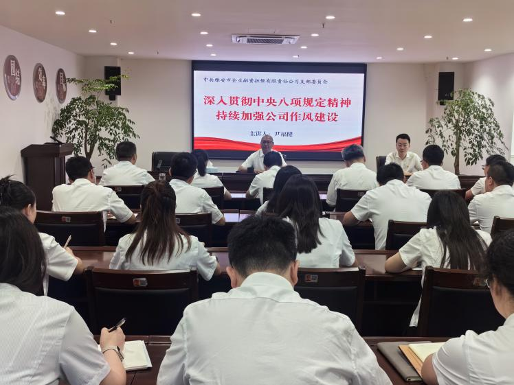 二是黨支部書記講專題黨課。市擔(dān)保公司黨支部書記、董事長尹福健以“深入貫徹中央八項(xiàng)規(guī)定精神,持續(xù)加強(qiáng)公司作風(fēng)建設(shè)”為題,為全體黨員、入黨積極分子講授了一堂生動(dòng)的專題黨課。黨課圍繞充分認(rèn)識(shí)開展學(xué)習(xí)教育的重大意義、深刻把握中央八項(xiàng)規(guī)定精神的豐富內(nèi)涵和實(shí)踐要求、充分認(rèn)識(shí)違反中央八項(xiàng)規(guī)定精神的嚴(yán)重性和危害性以及準(zhǔn)確把握黨的作風(fēng)建設(shè)的重點(diǎn)任務(wù),自覺強(qiáng)黨性正作風(fēng)守紀(jì)律等4個(gè)方面展開,為進(jìn)一步加強(qiáng)作風(fēng)建設(shè)指明了方向、提供了遵循。